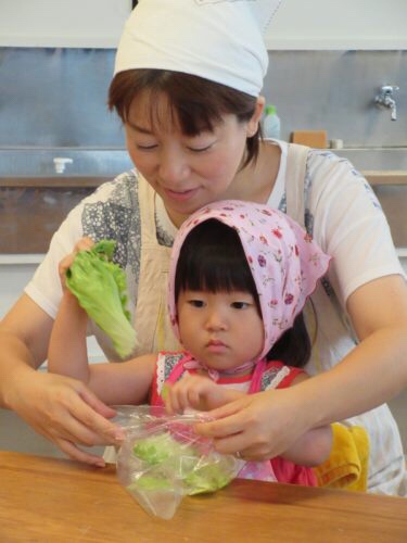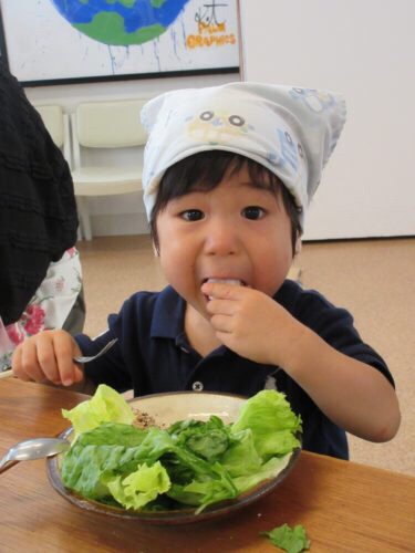 去年同様「音とたべもの」と題して、3歳でもできる食べ物との関わり合いを通して、