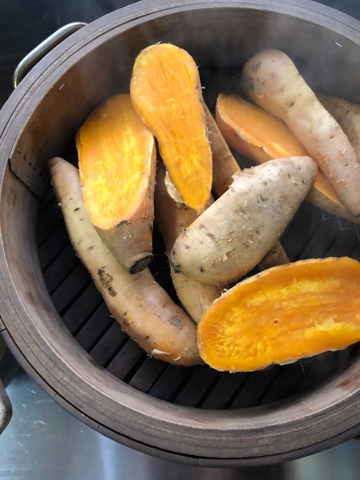蒸篭で蒸したさつまいもを春巻きにしたり、
