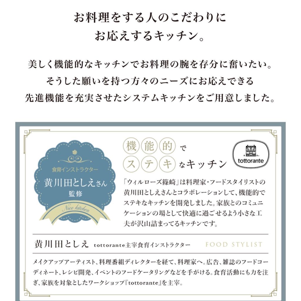 THEグローバル社様が手掛ける、東京都江戸川区の新築分譲マンション「ウィルローズ篠崎」のキッチンを監修させていただきパンフレット等にも掲載いただいています。
